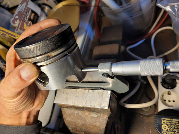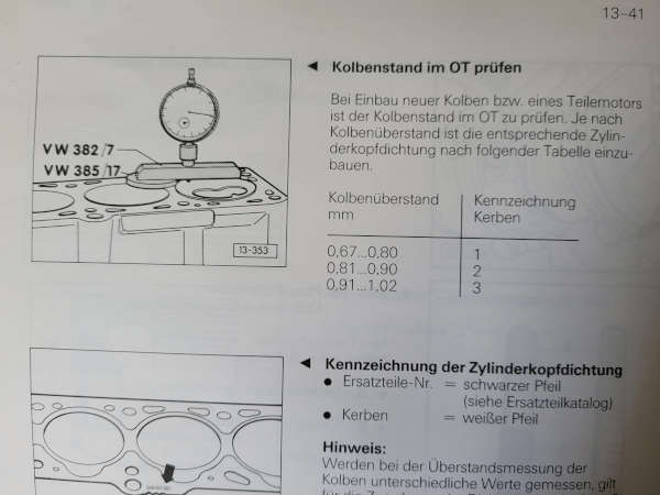 Das Zylinder- und Kolbenmaß wird ermittelt. Die relevanten Wertvorgaben sind in der VW Reparturanleitung beschrieben. Das Kolbenübermaß bestimmt die Stärke der Zylinkerkopfdichting (früher Kerben, jetzt Löcher 1,2 oder 3).